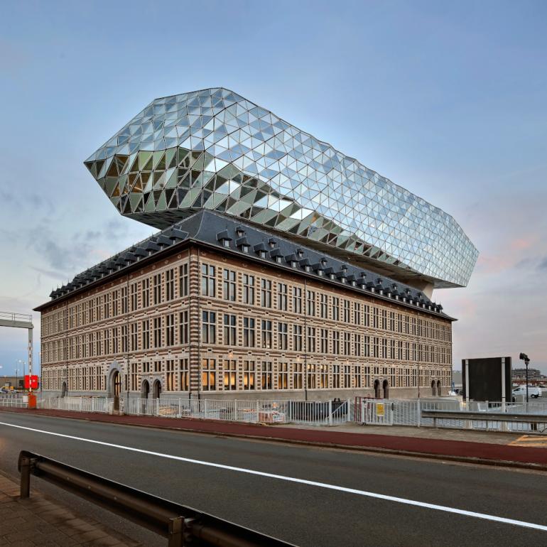 The lower part used to be a fire station at the far end of the harbour. During the renovation, this beautiful barracks has been preserved and now this place is designated to be the beginning of the extensive port area. There is no clearer symbol of the growth of the port of Antwerp. The new part is poised above the historic fire station like a glittering diamond, with its tip pointing towards the Scheldt like the prow of a ship. The glass superstructure reflects the varying shades of port, water and air. The flat and rippling surfaces, alternating between each other, represent the waves of the Scheldt. The glistening diamond is a clear reference to the Antwerp diamond trade. This is a metaphor for the port of the 21st century: a port with a rich past, ready for the future.