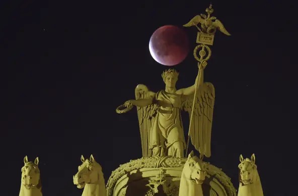1- Angelos Tzortzinis artfully lined up his shot to position the blood moon above the statue of the ancient goddess Irene in central Athens, Greece, to make it appear as if the deity was gently brushing the lunar disk with her right hand, while holding a child in the other.