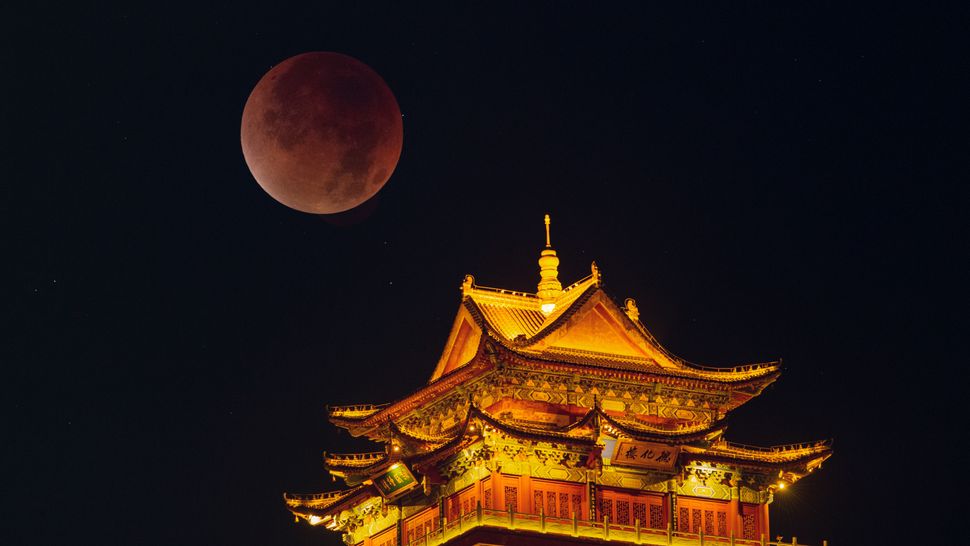 5- Yang Bo captures the sky over Nanjing, China during totality, creating the illusion that the blood moon is being grasped in the claw of a vast stone dragon.