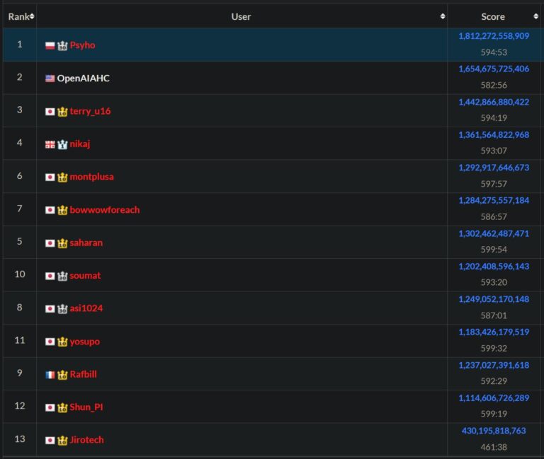 The final contest results showed Psyho finishing with a score of 1,812,272,558,909 points, while OpenAI's model (listed as "OpenAIAHC") scored 1,654,675,725,406 points—a margin of roughly 9.5 percent. OpenAI's artificial entrant, a custom simulated reasoning model similar to o3, placed second overall, ahead of 10 other human programmers who had qualified through year-long rankings.